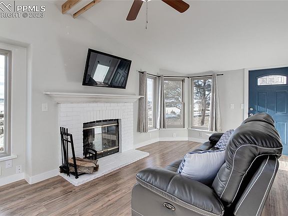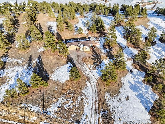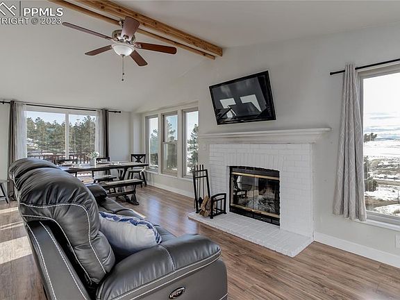 Welcome home to your very own country retreat away from the hustle and bustle of the city! This wonderful home is perfectly situated on 6.89 acres of pure serenity surrounded by mature trees, rolling hills, grass fields, and miles of stunning views of Pikes Peak! Move in ready with an abundance of natural light, this property features an open concept feel and newer windows and sliders. The spacious kitchen boasts self-closing white cabinets, matching Whirlpool stainless steel appliances, and a breakfast area that opens to the living room, complete with a cozy, wood burning fireplace. Open to the living room lies a charming dining room that conveniently leads out to the deck, which is shared with the owners’ suite. This deck features fabulous mountain views for enjoying a morning cup of coffee or an afternoon beverage. The owners’ suite boasts a walk-in closet, dual vanities, and a skylight to bring in even more natural light. There are two more bedrooms, a full bath, and a laundry room with a full-size GE washer and dryer which complete the main level. The walkout basement features a spacious family room with a wood burning pellet burning stove, two bedrooms, and a three-quarter bathroom. There is an oversized two-car garage, a west facing driveway, two sheds, a chicken coop, and a fully fenced property with endless possibilities. Just use your imagination, the sky is the limit. Call today for your own personal showing!