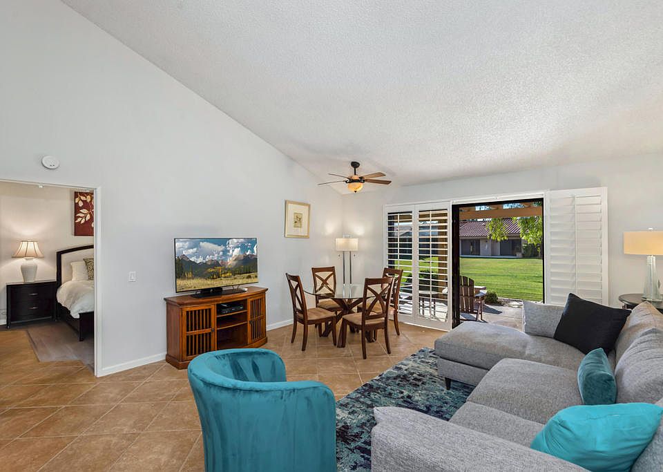 THIS IS THE ONE! Beautifully updated and turnkey furnished... including a GOLF CART! This condo is perfectly located within Palm Desert Resort County Club and a short easy walk or golf cart ride to the Clubhouse. This also one of the few communities where SHORT TERM RENTAL is allowed. OPEN FLOOR PLAN with high vaulted ceilings and there are two spacious bedrooms on opposite sides for privacy and each with patio access...and both with huge walk-in closets. Fabulous kitchen is open to the living and dining area; and from where you step outside to a huge patio and take in the peaceful GREENBELT VIEWS and peek-a-boo mountain view while relaxing or dining alfresco. The 2-car garage is attached with direct entry plus there is an indoor laundry room. The Resorter is an active community with a renowned tennis and pickle ball complex, 20 pools and spas plus the 18-hole championship golf course with driving range and a newly renovated Clubhouse with restaurant and bar. Great Palm Desert location so close to fine dining and shopping at El Paseo, the Indian Wells Tennis Garden, Acrisure Arena, and the Polo/Festival grounds. Don't miss this opportunity to enjoy the desert lifestyle and this very special resort community.