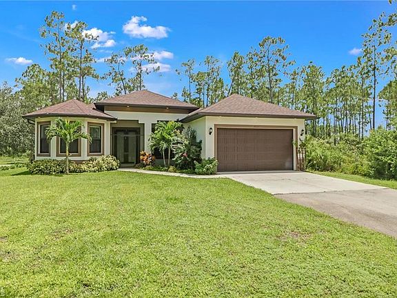 PRIVACY WITH NO RULES OR RESTRICTIONS! Golden Gate Estates 3 bed/2 bath/2 car garage home on 1.14 landscaped acre lot built in 2018 is ready for you to move right in and start enjoying! Peace of mind with impact resistant doors and windows. The front walkway is beautifully landscaped, and the front entrance features a small screened porch area, ideal for your plants. Step into the spacious living/dining area with tray ceiling and crown molding, ideal for entertaining and family time. Tiled throughout, the home's kitchen features stainless steel appliances, white cabinetry and gorgeous granite countertops with a breakfast bar and seating. Split bedroom layout for privacy, the huge owner's suite with tray ceiling features 2 walk-in closets, and the en-suite bath has tiled shower with glass doors and granite dual sink vanity. Two additional spacious bedrooms with large closets, and shared bath with tiled wall tub/shower combo with glass doors and quartz vanity. Reverse osmosis system installed. Screened back lanai with pavers is ideal for enjoying your evenings entertaining or dining. Large cleared back yard with above ground pool and deck has plenty of room for a garden or firepit.