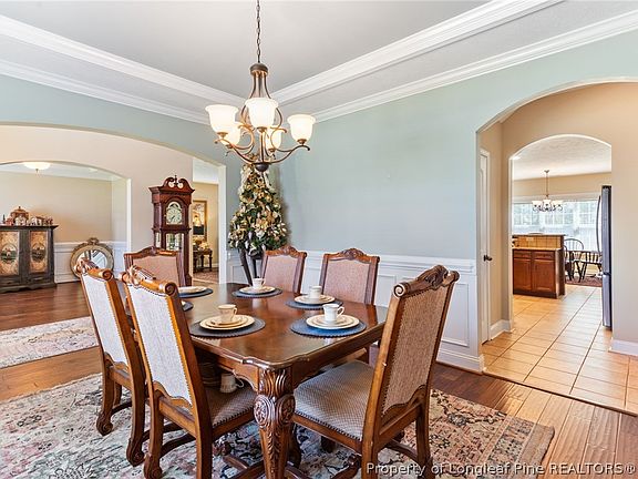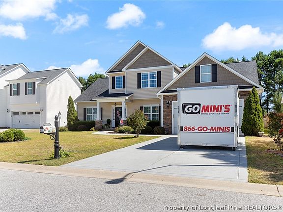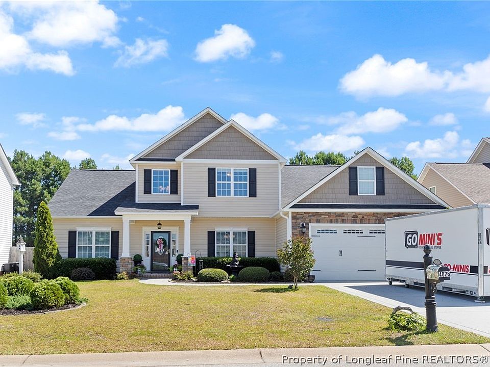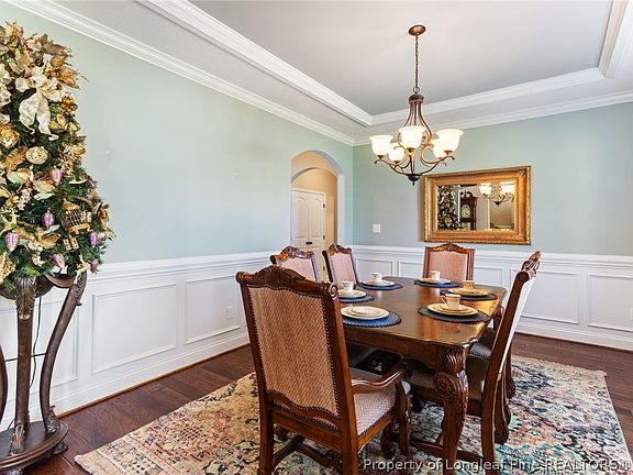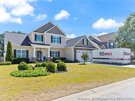 Welcome to this stunning two-story home featuring 4 bedrooms and 3.5 bathrooms, spanning 3002 sq ft. Enter through a grand two-story foyer leading to formal living and dining rooms. The heart of the home is the kitchen, boasting granite countertops, wrap-around bar seating, and stainless steel appliances. Upgraded with engineered hardwood flooring on the first floor, this home showcases custom trim details. The first-floor primary suite includes a large walk-in closet and a luxurious bathroom with dual vanities, a garden tub, and a separate shower. Upstairs, a second owner's suite with an en-suite bathroom, two additional bedrooms, and a full bathroom offer ample space. Enjoy the privacy of your fenced backyard from the covered back porch. Located in a community with a park, and just a short drive to Fayetteville and Fort Liberty.