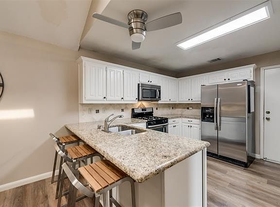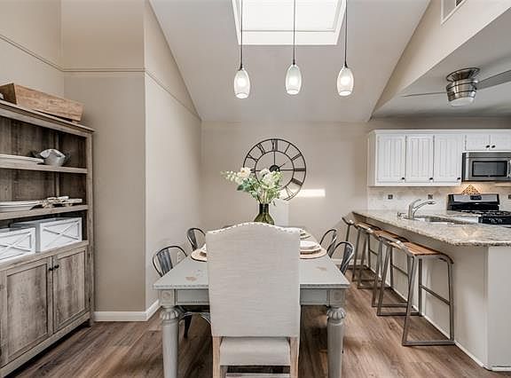 Super cute zero lot home in Addison with no HOA is waiting for you! Excellent floorplan with master bedroom plus second bedroom downstairs. Third bedroom is upstairs with full bathroom, creating nice separation for privacy. Tons of natural light with plenty of windows and skylights. Vaulted ceilings really add to the spacious feeling of the home. Flex room at front of home can be extra living or dining or home office. Kitchen features beautiful granite counters, gas range, built-in microwave, refrigerator, breakfast bar. Laminate floors through downstairs except for bedrooms and bathrooms (carpet and tile in these). Enjoy time in the back yard on the large wooden deck and relax in your hot tub! Outstanding location close to city parks and trail system, Addison Athletic Club, playground, dog park. Just a short drive to Addisons amazing dining establishments, retail, and entertainment. Join Addison Athletic Club for $10 one-time charge for residents only.
