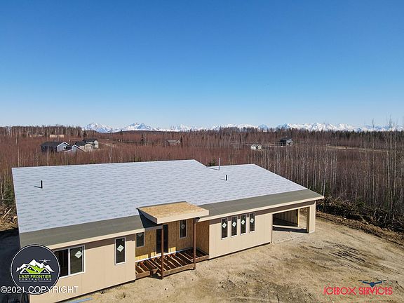 60-days to completion! Modern architecture with mountain views. Beautiful and efficient split-bedroom ranch home, open floorplan with 16' modern vault ceiling in living areas and master bedroom. Impressive covered back deck. His/her shower in master bath; tiled main bath tub. Modern kitchen features white-glossy cabinets, chimney-style range hood, waterfall quartz countertop.Walk in pantry with shelves and window for natural light. Triple sliding glass doors to covered deck from the living area, single slider from master bedroom. Oversized mudroom from garage includes closet, built in bench and recessed laundry area. LVP flooring throughout, no carpet. Siding will be Last Frontier's signature modern-look combination of lap, board & batt and metal. This one-of-a-kind custom home is 2-months from completion and can be yours in a fraction of the time it takes to build!