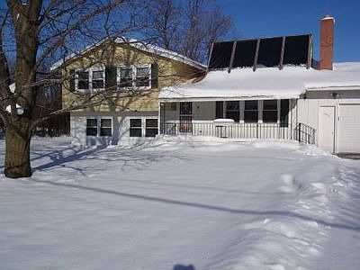 Bright and pleasant 3 bed 1.5 bath split level style house with fully fenced, large back yard no residence behind. The home features an attached 2 car garage and a HUGE 3-season room on the back of the house accessed from sliders in the dining area. The main floor has kitchen, dining area and living room with wood burning stone fireplace with wood stove insert. The second floor has 3 beds and 1 bath. The partially finished basement has lots of windows, a door to the back yard, a half bath, laundry and an efficient pellet stove. Solar panels supply some of the heat and hot water.