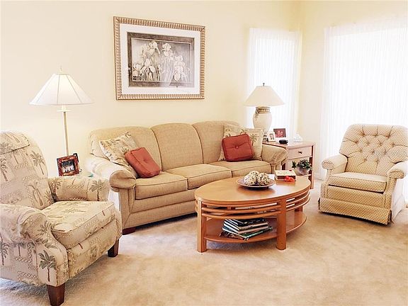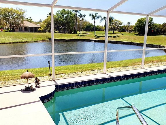 What a View!!! Relax in the Pool and witness Nature on the Lake and Golfer's Hole-in-ones! This Turnkey Home overlooks the 3rd Green and 4th Hole. Your new Home had the Tile Roof replaced in 2017 and is good to go! There is plenty of space to cook in the Spacious Kitchen with Island and lots of replaced Cabinets. Large Pantry and Walk-In Closet could be a great Inside Laundry. Read a book on the Patio off Kitchen or the Patio off the Dining Area. Entertain in the spacious Living Room/Dining Room with Nook for a Dry or Wet Bar. Great Split Floor Plan with the Master Bedroom overlooking the Pool and Lake, with the Second good-sized Bedroom in front of the Home. Use the Den as an Office and/or Guest Room with the Pull-Down Murphy Bed and Built-in Shelving. Spacious Master Bedroom with Sliding Doors to Lanai and Pool, nice Walk-In Closet with Organizers, Large Master Bath with Dual Sinks, extra Cabinet, Garden Tub, and separate Water Closet with Shower. Living Room has Full-Wall Sliders to bring in the Fresh Air! Plenty of room for storage in the Oversized 22x24 Garage with Cabinets. What a great Home with spending under $400/month to get your Lawn Care, Cable, and Internet. What a great Community to enjoy Member-only Events, Holiday Golf Scrambles and Lunch, Member Golf rates, newly revamped Pickleball and Tennis Courts, Aerobics, Swimming Aerobics, Card Clubs galore, Reading Club, Bocce, Golf Leagues of all sorts, Clubhouse and indoor Lounge, and Large Heated Pool, and don't forget fun at the Tiki Bar with frequent Member happenings. You will be able to easily spend $450/year for the Food & Beverage minimum! There is only a One-Time Capital Contribution of $1,395. See you around soon!