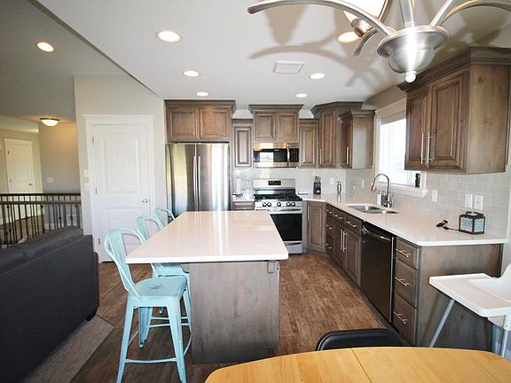 This beautiful home on 1+ acre lot in Teton Heights subdivision in Rigby is new this year! This split plan has open living spaces with custom finishes and many upgrades throughout such as: quartz counter tops in kitchen, brushed nickel hardware throughout, subway tile backsplash, gas range, gas fireplace and upgraded patio doors and larger patio! Other features you will love include staggered kitchen cabinetry, center kitchen island, stainless appliances, granite tops and tile tub surrounds in bathrooms, tray ceilings in master, a bay window, jetted tub, double shower head in walk-in shower, central air and tasteful colors throughout. Basement exterior walls are framed, insulated and ready for your finish. Come and tour it today.