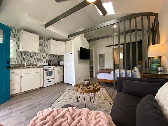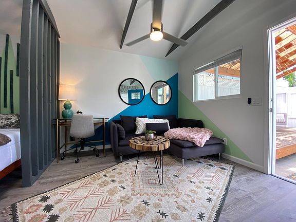 Flexible lease options OK! Pets ok. Beautiful large studio/ hybrid 1 bed with separation wall with high ceiling and feels double the size since your front door opens to a huge private yard with 2 pergolas, lounge furniture and a fire pit! Private parking spot and a laundry room attached to your unit right outside your gate! Cool outdoor lights at night with fire pit! Inside all newly remodeled! Granite countertops, awesome tile work, desk work area, high speed internet! Open to mid term leases