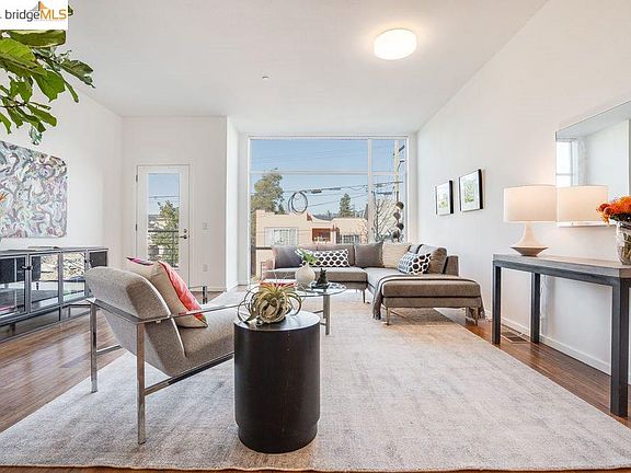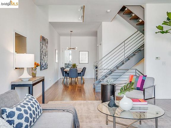 A dramatic and spacious modern townhome in an A+ Temescal location, this architecturally striking 3-level home has expansive open plan living areas with soaring ceilings, huge picture windows with pretty green hills views; three cozy en suite bedrooms, including a separate office suite/Zoom room with direct access to a tranquil fenced backyard. Guest bath on the main level. Just-refreshed roomy open kitchen with new quartz countertops and a stylish mid-Century-inspired backsplash, new GE fridge & gas cooking. Interior access from the attached garage. Gorgeous refinished caramel-hued hard-strand bamboo floors throughout contrast with freshly painted on-trend crisp white walls. The top-floor primary bedroom suites boast new luxury wool carpet, walk-in closets & full bathrooms. Get the best of both worlds: A Dwell-worthy and low maintenance newer construction home, with the amenities and feeling of privacy of a detached home. Fantastic neighborhood restaurants/amenities; close to BART.