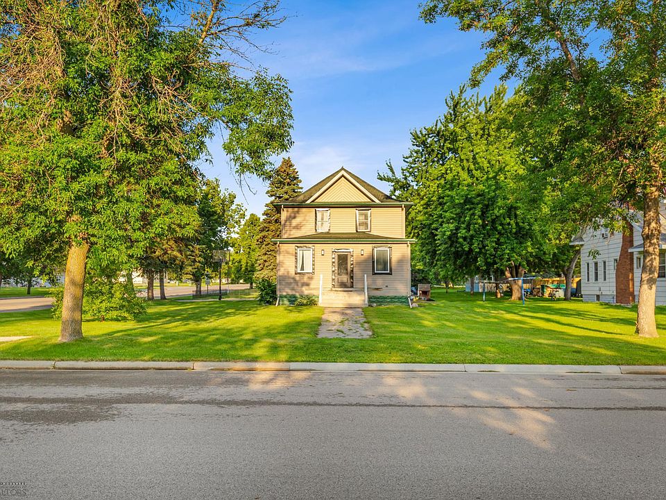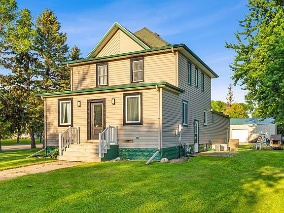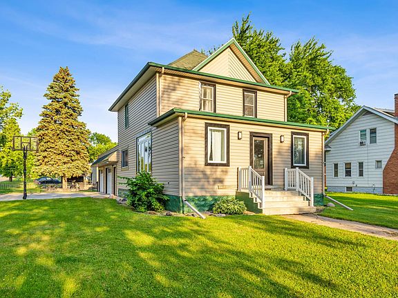 Perfect small town starter home on a spacious corner lot. This charming 2-story home features modern updates including new flooring, newer windows, updated bathrooms, modern stairs with motion lighting! The updates create a fresh, inviting atmosphere. With 3 bedrooms upstairs, 2 baths, and an office on the main floor, plus an open kitchen dining area with large living room, this home is turn-key! Enjoy the convenience of a 2-stall heated attached garage and a bonus 3-stall detached garage shop, measuring 23 x 32. Outside, the landscaped yard with mature pines offers the perfect entertainment space. Schedule your showing today and make this house your new home!