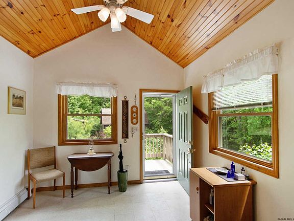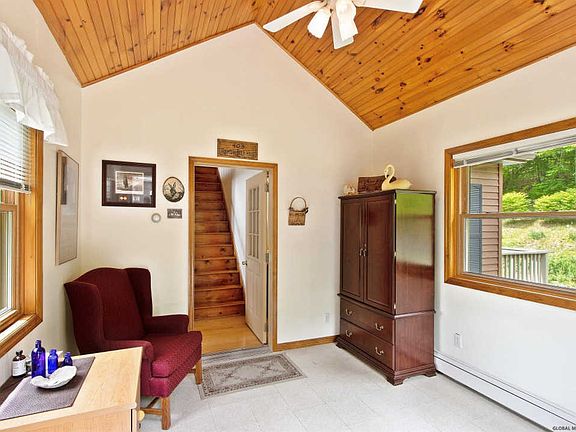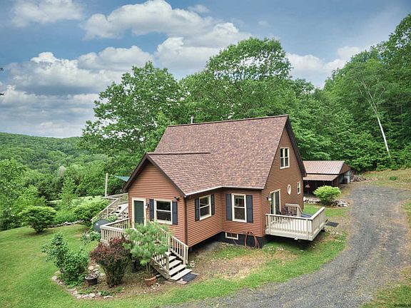 Escape to a gorgeous property w/ breath-taking views & secluded get-away home! Meticulously maintained chalet style home w/ cathedral ceilings opening up to the 2nd floor loft. Knotty pine throughout & large windows for plenty of natural light makes this feel like a retreat! Open concept on the 1st floor where the living, dining & kitchen all flow together. Enjoy cozy nights w/ top-shelf wood-burning stove! From the living area, step out onto the large, beautiful deck and take in those incredible views. While you're at it, enjoy a relaxing soak in the new hot-tub! First floor master bedroom w/ walk-in closet & separate deck entrance. Upstairs loft could easily be turned into second bedroom. Separate building on property could serve as artist studio or gym. Adjoining lot/acreage available!