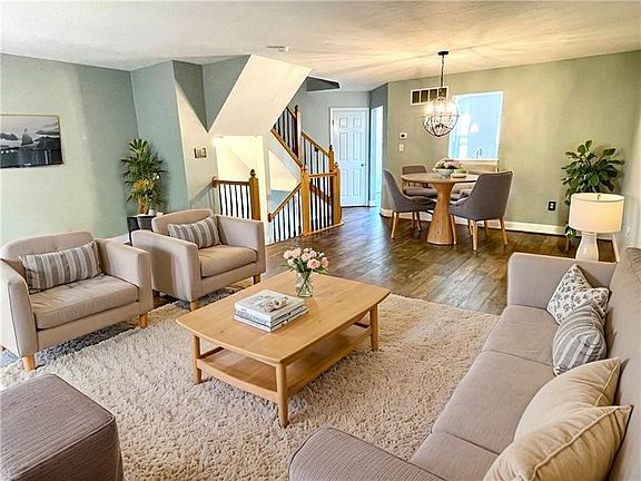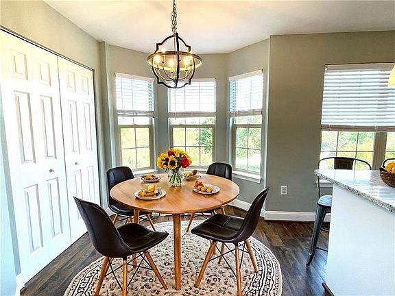 Enjoy this walkable, pet friendly neighborhood with 2 parks, community pool and offers maintenance free living right in Seven Fields! Natural light from the bay window brightens the eat-in space and fills the whole kitchen with sunlight! Entertain your family and guests in the updated kitchen with granite countertops, center island, plenty of cabinet space and pantry. New flooring throughout kitchen, dining and living room creates a seamless flow through the main living space. The dining and living area features a gas fireplace and access to the private back deck with raised bed planters. Half bath just off of the kitchen. Upstairs you will find the primary suite with a walk-in closet, 2 additional bedrooms and another full bath. The lower level holds a game or storage room. Low HOA fee that covers roof, lawn care and pool access.