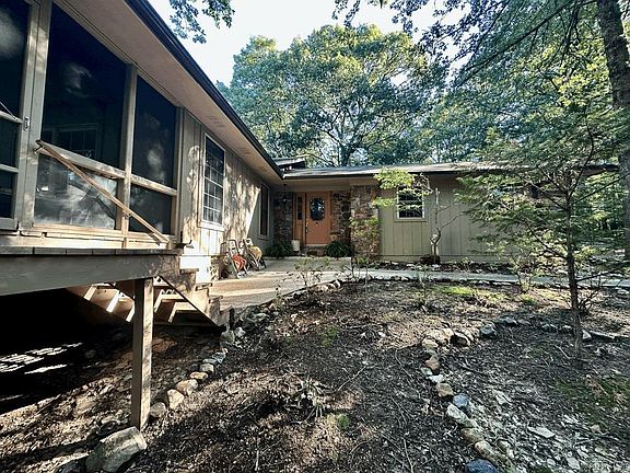 This 3 bedroom 2 bath home is tucked away on 6.7 acres in Mount Ida. 2063 sq ft. And when I say "tucked away", I mean it is at the end of a street and secluded. It is a well built home and my favorite part is the outside space but you are welcome to form your own opinion. 27x9 screened in porch with vault ceiling and a 352 sq ft deck with beautiful iron work around it. Yard is partially fenced for the pets and has a nice garden area with raised beds. As you walk in through the front door, the flagstone floor is the first thing you see and when you walk in to the living room the local rock wood burning fireplace makes you want to sit down and enjoy some flames and read a book out of the custom made bookshelves. Kitchen has a breakfast nook. There is a separate dining room. Primary has a large bathroom and walk-in closet. Laundry room has lots of space. 31x15 insulated basement has the potential to store so much or, with a little bit of work, converted to living quarters. This lot is mostly wooded. Solid and clean place.