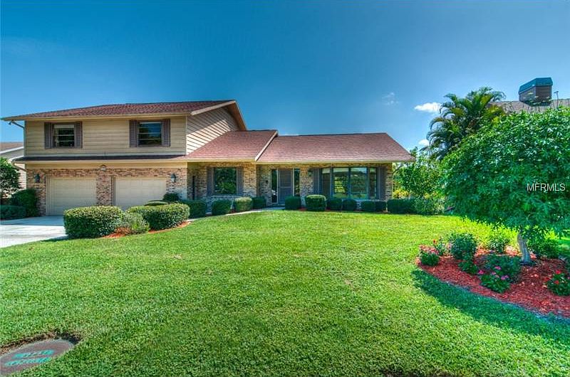 Charming waterfront home on the Bayou. This multi-level home offers open kitchen with stainless steel appliances, Wolf gas cook top stove, solid wood cabinetry, 2 pantries, and granite countertops with a breakfast room. The adjoining family room has a brick fireplace and built in shelving. Lovely lanai and pool area (pool has been remarcited) overlooking the bayou. This home is located on a large, picturesque lot which is just a little under ½ acre. The property gently slopes to the boat dock with a 10,000 pound boat lift. Flood insurance is optional due to the elevation. There is a den/4th bedroom on the first floor and the master bedroom is spacious with a huge walk-in closet with customer built-ins. All of the home is tiled with exception to the bedrooms and you will love all the storage and the 2 ½ car garage. The upstairs A/C was replaced in 2013.