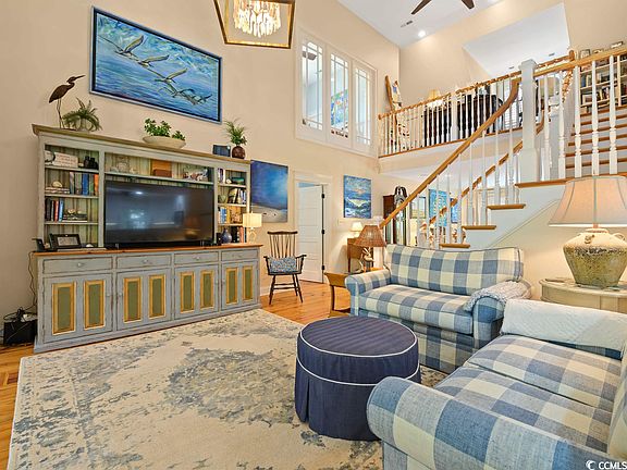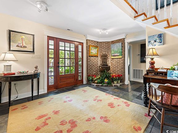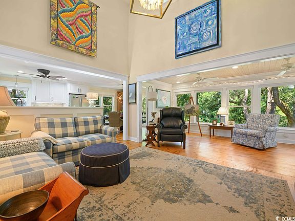 This exquisite home, with its beautiful porches and lusciously landscaped surroundings, has the flair of a tropical paradise with design and decor for the discerning buyer and is only a short walk to desirable North Litchfield Beach. The very appealing 1/2 acre homesite is serenely nestled in mature landscaping with lush greenery and many mature live oak trees to add to the Lowcountry ambiance and provide privacy for your personal paradise. The breathtaking "Brookgreen Gardens" like view from the porches and sunroom sets this home apart. Large lower screen porch overlooks a private garden area. This home is located on one of the highest homesites at North Litchfield Beach. With its open floor plan in the main living area this home boasts a recently renovated kitchen with custom built cabinets and quartz countertops, stainless steel appliances and tiled backsplash. Kitchen dining area opens out to deck overlooking the peaceful pristine back yard. Heart of pine floors in the main living areas, dramatic high ceiling lines, winding custom built stairway, built-in daybed, lovely mantel and beautiful window trim highlight this home and add so much southern charm. All 4 large bedrooms feature recently renovated ensuite bathrooms with tiled showers. The two main floor baths have granite counter tops and the ground floor bath has quartz countertops. The space currently used as an office (with closet) easily doubles as a glamorous 5th bedroom and has a beautiful Palladian window with glass wall overlooking the main floor. The downstairs area would be perfect for an in-law suite or private guest quarters. This home boasts triple pane hurricane windows and doors, soaking tub in master bath, ventless gas fireplace, 3 HVAC units, 2 hot water heaters, sprinkler system, outdoor shower, fenced in back yard and much more. North Litchfield Beach, also known as a bird watcher’s paradise is conveniently located to Brookgreen Gardens and other beautiful beaches of the Atlantic Ocean such as Pawleys Island and Huntington Beach State Park, restaurants, shopping, art galleries and medical facilities. For those seeking an active lifestyle, there are miles and miles of bike trails and many world class golf courses. This gorgeous tropical retreat, that is great for daily living as well as gatherings and entertaining, is calling you to make it your home. Come, relax, play and have fun in the sun at Pawleys Island, South Carolina, where you can feel like you are in your very own island paradise. You can enjoy everything that Myrtle Beach and Historic Charleston have to offer for the day or evening and return back to the laid-back serene lifestyle in North Litchfield Beach. Don’t forget to take the virtual tour found in the listing details.