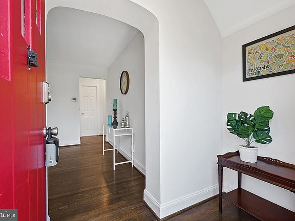 Upon arrival, a welcoming foyer with a cozy nook and coat closet sets the stage for the inviting interior. The bright living room showcases beautiful wood flooring, while the dining room, complete with a modern chandelier, opens onto the screened porch, seamlessly blending indoor and outdoor living. The renovated kitchen features handsome Shaker cabinetry, stainless steel appliances, gas cooking, and a gorgeous quartz counters, creating a functional and stylish space. The main level also includes a renovated full bathroom and two bright bedrooms with ceiling fans and hardwood flooring. Upstairs, the large and private primary bedroom offers charming built-ins and extensive eaves storage, providing both character and functionality. The finished lower level expands the living space with a roomy family room, a modern full bathroom, and a convenient laundry area. Outside, the deep fenced yard provides plenty of space to play and entertain, featuring a beautiful expansive stone patio perfect for outdoor gatherings. Enjoy living in eclectic Takoma Park, where this home offers both charm and convenience. Just minutes from shops, restaurants, the Red Line Metro station, the Farmer’s Market, and Sligo Creek Park and trails, this location also provides easy access to Jackson-Boyd Neighborhood Park and other nearby green spaces.