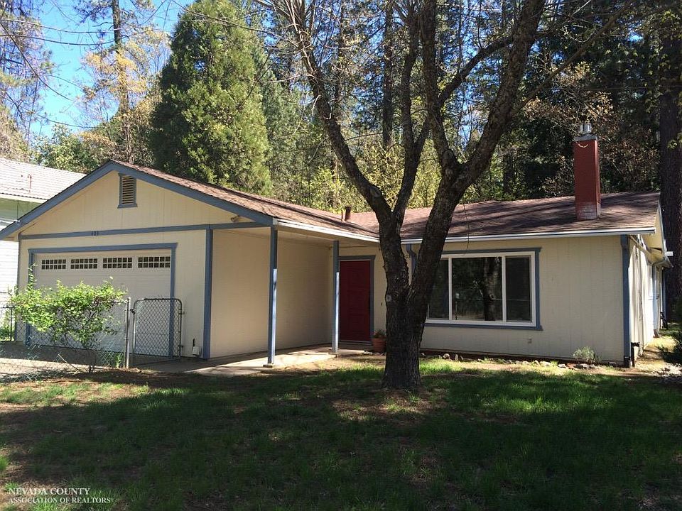 Sweet single level 3/2 home on pine studded fenced 1/2 acre lot. At corner of Long and Turpentine. Clean, freshly painted and carpeted throughout. Home has natural gas heating, air conditioning, newer vinyl windows, covered gutters and gas log fireplace. New refrigerator, natural gas stainless steel stove. Automatic garage door opener, covered gutters. Clean as a whistle. Great location, close to Pioneer Park and down town Nevada City.