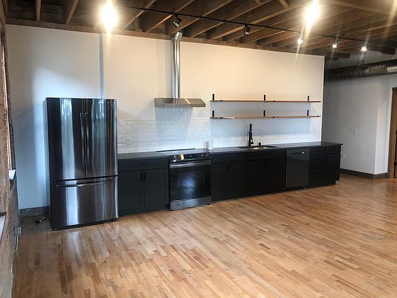 Quartz topsSubway tiled shower stallExposed brickFloating shelvesCustom vanitiesRefinished original hardwood floorsBlack stainless steel appliances