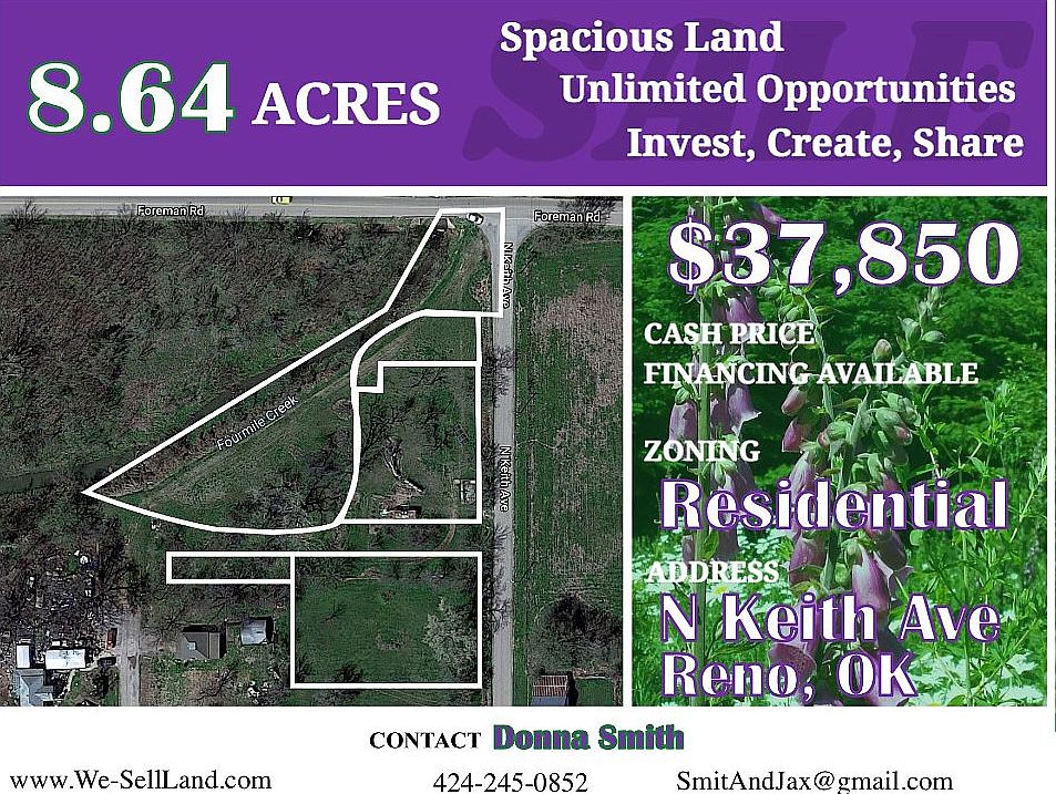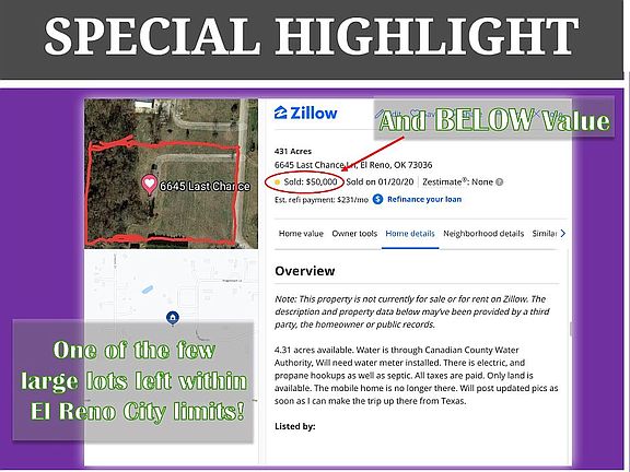 Perfect 8.64ac Spit-Parcel Build Site near O.K.C. Selling at 84% of Value Selling an Incredible Deal! Don’t miss out on it *************************** This is one of the few large acreage left within El Reno City limits! And yes, it’s BELOW Value! El Reno is a very peaceful, historic place, with a variety of things to do. Go to the lake with friends & family, catch some fish, swim, play & drive around viewing the picturesque scenery. Or go downtown to walk around, explore the divers places to eat & shop. It’s a small town atmosphere with large City conveniences, being so close to O.K.C! Are you ready to become a part of this fast growing town, filled with friendly & helpful people? Lets connect, So you can learn more about this special offer or seller financing is available. We’re willing to split the acreage if desired! *************************** To visit the parcel, put the following addresses in Google Maps: 403 N Keith, 3 lots & 1015 W Penn, 2 lots.The residential zoning allows a spacious Ranch or a Modular/Mobile home (only allowed on lots over 5 acres). Buyer must contact the zoning dept for more building information. There was an old house on the 3 bundled properties at 403 N Keith. Electricity, Water & Sewer is accessible at the street for all 5 lots. Please keep in mind lot #090026375 has a creek on it. Buyer must verify & work with County to know what can & can't be done with the land, obtain proper permits if needed & confirm the availability of any utilities needed/serviced on the lots. Seller makes no warranties or representations about the land, its condition, or what can be built on the parcel. *************************** Own of all these great properties for just $37,850 cash! Or buy one 3 lot bundle for $21,350 & 2 lots for $16,500. Financing offered, contact us for details. *************************** The Historic Fort Reno is a site that’s a round a corner & a Must See, once you’ve settled in. This is a Great historic site, with lots of history. Plus being so close to O.K.C. means trips to the Zoo & Botanical Garden will be a breeze. This place is great for a day outing of relaxation with fun animals. Keep in mind that this is one of the few large lots or acreage left within El Reno City limits & it’s well Below value! Plus it's in a Great Location! With lots of easy access to amenities & a variety of stores & restaurants less than 5 minutes away. As you know O.K.C. is only 30 minutes from the lot & Tulsa, only a 2 hour drive east. That makes for a great weekend get away! *************************** Purchasing property from us is quick & effortless. This lot will be closed by a local title company & is guaranteed to be free of all liens and encumbrances. Buyer will receive title insurance & warranty deed. Message us here/call us today to get started. *************************** You can purchase all the lots with cash for $37,850 or bundle 3 lots at $21,350 & 2 lots for $16,500. Financing offered, contact us for details. *************************** Property Details: Lot Type - Land Bundle ALL Price - $37,850 Bundle 3 Price - $21,350 @ 403 N Keith Bundle 2 Price - $16,500 @ 1015 W Penn State - Oklahoma County - Canadian Assessor's Parcel Number - 090026063, 090026064, 090026375, 090026065, 090026066 Property Usage: Single Family, Modular/Mobile home Property Address - 403 N Keith (bundles APNs 63, 64, 75) & 1015 W Penn, El Reno (bundles APNs 65 & 66) Size - 8.64ac all, Bundle 3 - 8.05ac, Bundle 2 - 0.59ac Road Access - Yes, Unpaved Electricity - At Street Water & Sewer - City connections Market Value: Similar smaller sized lots in the area have sold for $50,000 *************************** To buy this lot at this discounted price call/txt/email Donna @ 424-245-0852, smitandjax@gmail.com. Don't miss out on this great deal call/text us now! Note: We also may have other lots at bargain prices just like this one available - ask us when you call!