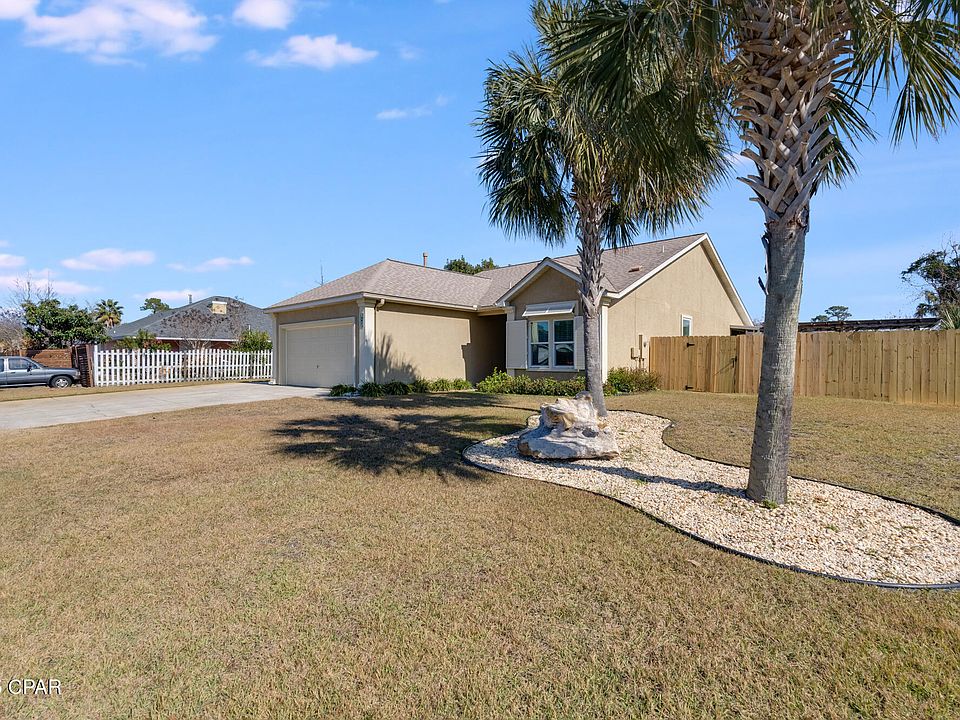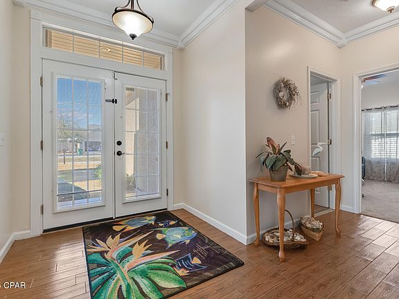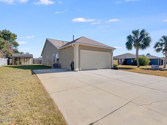 This immaculate and well-maintained 3-bedroom, 2-bath home in Panama City Beach offers a perfect blend of comfort and style, situated on a spacious lot convenient to everything. The beautifully upgraded kitchen features new appliances, quartz countertops, and a stylish glass tile backsplash. Soaring 12-ft ceilings with crown molding enhance the great room's open feel and the ventless gas fireplace adds the right amount of warmth. Desirable split-bedroom floor plan provides privacy and functionality with the primary bedroom located at back of the home. Large walk in closet and stylish barn doors lead to the updated primary bath featuring dual vanity with quartz tops and separate water closet. French doors lead to a screened-in patio, overlooking a large backyard with ample space for a pool. Outdoor living is made easy with a 20x12 deck featuring a pergola cover, a large powered storage building, plus sprinkler system with a new well pump. Recent updates include a tankless water heater, storm shutters for all doors, high-impact windows, new carpet in bedrooms, and exterior paint in 2020. Don't miss this exceptional home—move-in ready and packed with upgrades!