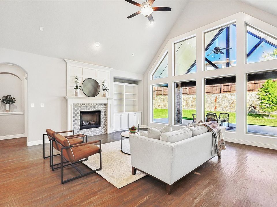 5T Ranch is unique! This neighborhood is ideally located in the heart of Argyle TX & six min to Denton Country Club, walkable to Hilltop Elem School via a back entrance. Features include:wide streets, tree lined trails, playground, soccer field, and a neighborhood FLOCK security system, NO PID TAX. The home has the perfect layout with three SPLIT bedrooms, each with their OWN FULL bathroom to ensure privacy for ALL! The chef inspired kitchen boasts granite countertops, a large island, double ovens, one with french doors, and a HUGE walk-in pantry. The kitchen opens into the impressive OVERSIZED living room with its' expansive floor to ceiling windows, tiled fireplace, and built in cabinets. This home features many CUSTOM add ons such as a coffered ceiling in the formal dining, crown molding through entire home and hardwood floors. The large .294 lot features a large backyard and The covered Back patio is a generous 12x21 ft with two Auto Sunshades. ROOF was installed in May.