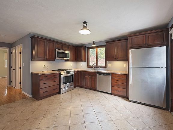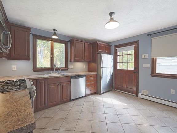 This charming 2,200 sq ft house offers a blend of comfort and convenience. Close to Rt. 93, the New Hampshire border and much more! Features 3 bedrooms upstairs and one bedroom in the finished walk out basement and 1.5 baths. The basement has full windows and a gas stove, while a wood burning fireplace adds warmth to the family room. The kitchen is a standout feature of this house with its spacious design, cherry cabinets, and stainless steel appliances. A Buderus boiler and superstore tank ensure efficient heating and hot water, and a water softener enhances the water quality. The house has top of the line Anderson windows that offer tons of natural light. Plenty of off street parking is available when you entertain.