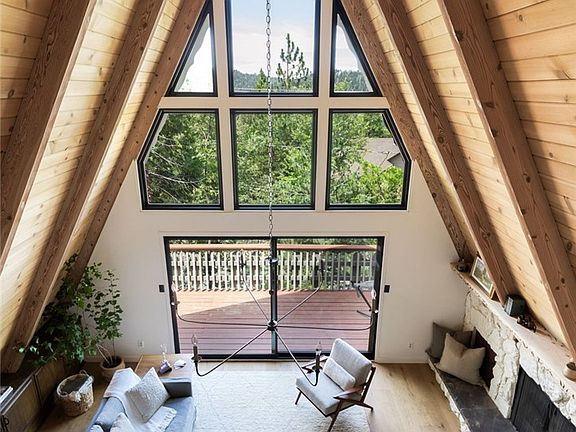 A refreshing take on a classic A-Frame cabin in the woods. Perched in the trees and with a secluded feel, this thoughtfully redesigned cabin is a true breath of fresh air upon walking in the door. Soaring natural wood ceilings complimented by a wall of (dual pane) windows creates a light and airy living space with views of evergreen trees out every window. White oak floors and designer light fixtures add to the modern yet cozy feel of the home. The main level features a centerpiece brick fireplace and remodeled kitchen amidst an open floor plan and large sliding doors to a deck with a hammock and panoramic forest views. The two cozy bedrooms on the main level are perfect for quiet retreating. Upstairs is the perfect cozy yet vibey loft with places to lounge and take in the soaring views from the top of the A. As the entry to the main suite, the loft is also a perfect extension of the main suite living space. Beamed ceilings, a large window and a built-in desk create a special space to reside. The lowest level of the cabin is the perfect space to gather with friends and family, host and have fun! A large additional living space with sliding doors, its’ own deck and a bathroom is the perfect place for movie night, game time or a friendly game of pool! The spaces to use do not end with the interior of the home. Outside you will find terraced decks and a barbecue area with built-in benches canopied by the mature trees. With lake rights and proximity to the golf course and town of Blue Jay, this home truly embodies the full mountain experience.