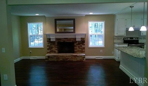 Modern features. .This well built brick ranch open concept style home is in the Jefferson Forest School District and close to Poplar Forest. This home has been upgraded with granite counters, new flooring throughout, brand new stainless appliances, and all new dual pane windows. One easy step to the kitchen at the carport to offload those groceries. This home features large rooms and a large wooded lot. Full heated basement has fireplace and 1 bedroom with half bath, and a large family room or rec room. On a corner lot with circular drive this home is move in ready. All newly upgraded for less than new construction at $71 per sq ft.
