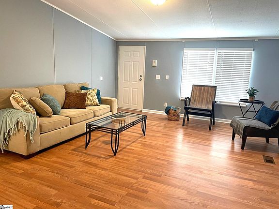Beautiful, updated doublewide home on a cul-de-sac lot. This home is move in ready and features many updates, with a great location with easy access to Simpsonville, Fountain Inn, Greenville, minutes from 385. The home has an open floor plan with a large living room, kitchen with an island, big dining area and a den with a fireplace. Split bedroom plan with master on one side and two bedrooms on the other side. The back deck is large and a good place to catch some sun or entertain friends and family. Architectural shingle roof was installed in 2018. Recent updates by the sellers include: water heater (sellers had a special water heater installed that has an almost endless supply of hot water), water line to street, water pressure reducer valve, retaining wall, french drain in back yard, moisture barrier in crawl space, reglazed garden tub, painted interior, new vinyl plank flooring in master bedroom, master bathroom, master closet and laundry room. Seller plans to leave the refrigerator and the washer and dryer.