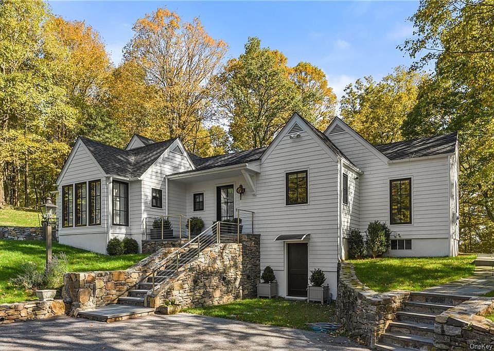 Nestled atop almost 3 scenic acres sits an EXTENSIVELY RENOVATED MODERN FARMHOUSE w/stunning abundantly lit interior spaces, gorgeous bluestone patios and spectacular stone walls. This interior designer's home was thoughtfully rebuilt in 2018/19 with an exquisite cooks Kitchen, custom colored hardwood floors and multiple sets of French doors that open to a courtyard. The open-concept Kitchen-Dining Area is the heart of the home. A beautiful Liv Rm with WB Fireplace and 3 sets of French Doors lead to a center courtyard that exudes the feeling of Montecito-chic. A cozy Fam Rm leads into the Master Suite area with 2 closets, renovated Bath + Primary Bedroom. Two add'l Bedrooms and a renovated Hall Bath are found on the opposite side of the Liv. Room. Lower level Play Area/Office opens to the side bluestone patio. Nearly three acres of spectacular views + privacy. Convenient location to shopping (incl. Chappaqua Crossing with Whole Foods Grocery + Lifetime Fitness), train + schools.