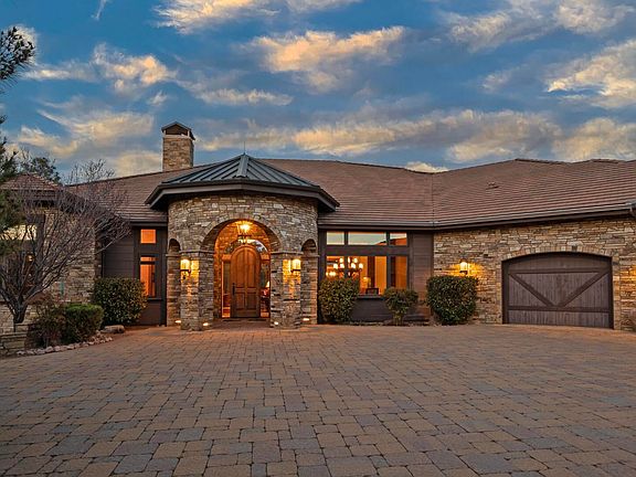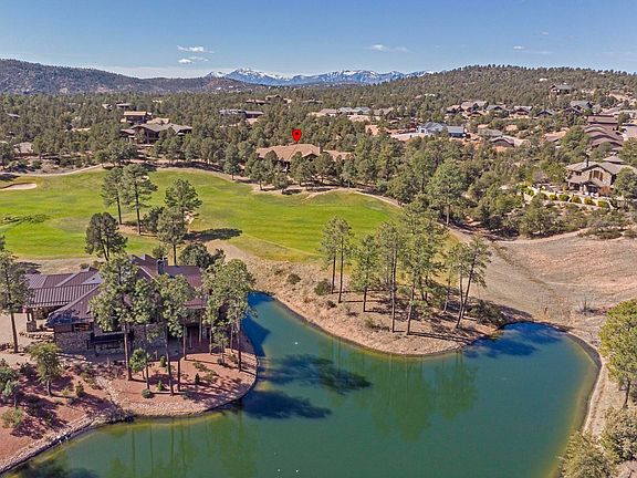 Escape to the perfect golf retreat set in the cool pines of The Rim Golf Club. This impeccable Mountain home offers single level living on the 5th fairway with a lake and Mountain views. Unique and one-of-a-kind this custom-built residence is a rare single level. Enter the home from the copper roofed front porch through the impressive large entry, tiled and solid hardwood walnut flooring, large beams, vaulted tongue & groove ceilings, stone fireplace, floor to ceiling windows with pocket door slider system that slides into the walls with electric screen. Enjoy the bar area with granite countertops, seating, ample shelving and storage, half dishwasher, ice maker and beverage cooler. The open concept with gourmet kitchen, gorgeous granite countertops, sub-zero refrigerator, dual sub-zero zero refrigerated drawers, ice machine, Wolf six gas burner and pancake stove top with dual ovens, warming drawer, custom ventilating hood, wolf microwave, Bosch dishwasher, breakfast bar, kitchen island, walk in pantry with lighting, eat-in dining and separate formal dining with tiled and walnut inlayed flooring, oversized wood beams and large window & draperies. Several walls are finished with elegant Venetian Plaster.