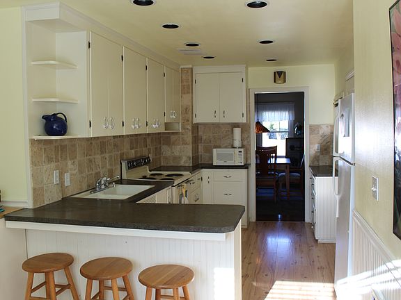 Charming Bungalow! Affordable comfort can yours at this well maintained 972 SF home. Features include 2 bedrooms, 1 bath, sunny eat-in kitchen with appliances included, tile backsplash, breakfast bar & built in hutch, welcoming living room & dining area with wood floors, walk in closet, partial basement with laundry area, shop space & storage, detached 2 car garage with loft storage space, shaded fenced backyard with patio and storage shed. Great location-easy access to downtown.