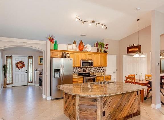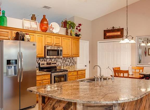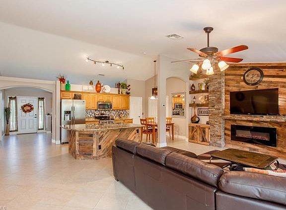 NO STORM DAMAGE! This beautiful updated and customized 4 bedroom home with a great room layout is a must see. The whole home has tile laid on a diagonal pattern (one guest bedroom has carpet on top that was designed to be removed without any damage). The kitchen has level 4 granite and the custom island is designed with rustic pallets that match the living room accent wall. The large under truss lanai faces a backyard so surrounded by a mature areca palm hedge for privacy, you'll forget you're near the center of town. New Lennon A/C (wi fi thermostat) and duct work 6/2015, new water heater 6/2015. Sulfur Filtration System- Removes Sulfur, Manganese, and Iron oxidizing the water for the whole house. After city water is installed it can be converted to filter the chlorine out. New granite countertops in master bathroom.