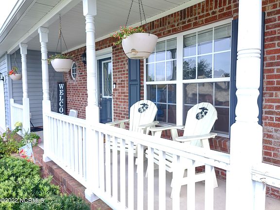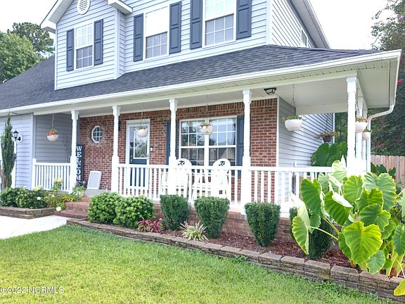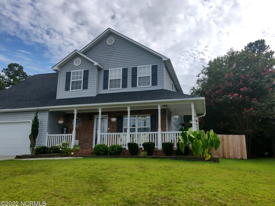 Charming two story home in the heart of Jacksonville, Convenient to shopping, military bases, medical facilities and more. Walk onto covered front porch and into the foyer of a well kept comfortable house. Entry foyer features deep coat closet. To the right enter a formal living area that leads into a light filled dining room. The dining room gives you a terrific view of a gorgeous back yard filled with lush grass and a variety of trees. Beautiful sunny room off the kitchen that can serve as a dining room, home office or Fido's personal sun room. A nicely sized kitchen featuring plenty of light, center island, white cabinets and a niche for your coffee maker or mixer. Kitchen appliances include SS glass cooktop range/oven, SS built in microwave, SS side by side refrigerator and dishwasher. Kitchen pantry closet for storage. Laundry located on 1st floor. Half bathroom conveniently located on first floor. 3 Bedrooms and 2 bathrooms plus Bonus Room are located on second floor. Master bedroom is generously sized with en-suite bathroom to include dual vanity sinks, separate shower and tub. After a long day at work and a soak in the tub it's time to kick back in a generous sized family room in front of the gas fireplace. Take to the Barbecue n' fun in the large fenced in back yard with a wood deck, patio and storage shed. Keep the cars and toys dry in a two car garage. Dog/cat door from house into garage. This house has great curb appeal and is located in the Bay Meadows subdivision off Huff Drive in Jacksonville, NC. Close to Northeast Creek Park and playground.
