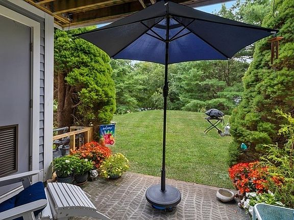 First floor unit in extremely desirable Hingham Woods!! The spacious living room boasts a wood burning fireplace and beautiful hardwood floors throughout. Recently updated kitchen with quartz counter tops & new stove with window into the dining room. Sliders open onto a secluded patio and beautiful outdoor space. Bathroom is newly renovated with glass walk-in shower. The large primary bedroom has two large double door closets & great light. Second ample bedroom is also light filled w/ plenty of storage. New water heater & AC unit; in-unit full size washer and dryer with more storage; and deeded parking space add to this great condominium. PLUS a spacious clubhouse with a gym, sauna, pool, & tennis/pickleball court! One mile to the commuter rail or ferry to Boston, direct access to Bare Cove Park, two miles to gourmet restaurants, exquisite shops, the sandy harbor & all that Hingham Square has to offer makes this the perfect location to call home!!!
