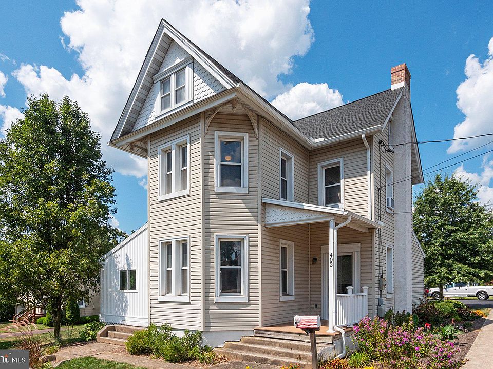 Quaint and obviously loved updated colonial with oversized garage on corner lot. This three bedroom, one and a half bath home has wide baseboard, wood flooring (in some rooms on second level), and other touches of its time, yet is updated with central air, convenient main floor laundry and powder room, beautiful granite kitchen with built-in microwave, dishwasher, and electric flat-top range, modernized tiled bathroom with walk-in shower, and architectural shingle roof. Enclosed back porch houses the powder room and laundry, while enclosed front porch is now an office with vaulted ceiling, for best use of the home's space. Neutral laminate waterproof flooring runs throughout the main level through the living room with exposed brick wall and open beams into the expansive dining room with plentiful natural light. Three bedrooms on the second level with updated bath as well as access to the floored attic, ceiling fans in almost every space of the house. This corner lot has a level yard, composite deck and side patio accessible from office, expansive paved driveway as well as shed and two plus car heated garage. It's quite evident the present owners have put more than thirty years of time, energy, and love into this property.