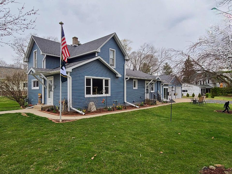 Attractive 1 1/2 Story with many updates. Beautiful eat-in kitchen features quartz counters, new stainless appliances (March 2022) and cloud lighting. Handy 1/2 bath has new vanity & tile floor. New flooring {Kitchen/dining, Feb 2023 Living/family, Oct 2019}. Large living room. Family Rm features an entire wall of built-ins. 1st floor laundry w/new washer & dryer. 3 Bedrooms. 2.5 Baths. Full Basement offers great potential for additional living space. Relax on the 3 Season Porch/breezeway between the house and garage. Attached 2 Car Garage with new overhead doors + openers, updated electrical and 4 new windows. Corner Lot. Mature trees & shrubs. Various garden beds. New vinyl siding (May 2022). Enjoy small town living in this well maintained home.