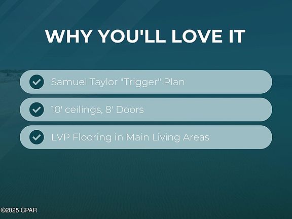 This property has sold! Discover similar listings by reaching out to us for an updated list of available properties that match your preferences. Located in the highly sought-after Breakfast Point community, this well-crafted 3BR/2BA Samuel Taylor home with 2-car garage seamlessly blends convenience, comfort, and quality. Nestled within a peaceful conservation preserve, the neighborhood features miles of trails, bike paths, green spaces and playgrounds - perfect for nature lovers and outdoor enthusiasts alike. Designed with both style and functionality in mind, this home's Trigger plan boasts a spacious open-concept living space with 10-foot ceilings, 8-foot doors, creating a bright and airy atmosphere. Sliding glass doors connect the indoors to the covered patio and flood the interior with natural light. The kitchen combines modern aesthetics with practicality and is equipped with stainless steel appliances, granite countertops, and ample cabinet space. Attention to detail extends throughout the home, with luxury vinyl plank flooring in the main living areas, durable tile in the bathrooms, and cozy carpet in the bedrooms. The large, fenced backyard offers a private retreat, ideal for grilling, relaxing, or hosting gatherings. Built to exceed hurricane code standards, the home includes 2''x6'' exterior wall framing, a hurricane tie-down rod and anchor system, architectural shingles, and enhanced insulation for added peace of mind. Breakfast Point's central location means you're just minutes from the sugar-white beaches of Panama City Beach, Pier Park and Frank Brown Park. Everyday conveniences like Publix, dining, banks, and more are just outside the neighborhood entrance. Families will appreciate being within walking distance from A-rated Breakfast Point Academy (K-12) and Arnold High School. Despite its accessibility, this community remains a serene retreat, tucked away from the hustle and bustle of the city. Homes in Breakfast Point are in demand for good reason. With its unbeatable location, natural surroundings, and close-knit community, this property offers a lifestyle like no other. Don't wait - schedule your private tour today and see why so many love calling Breakfast Point home!