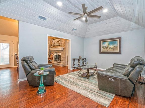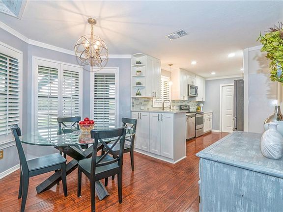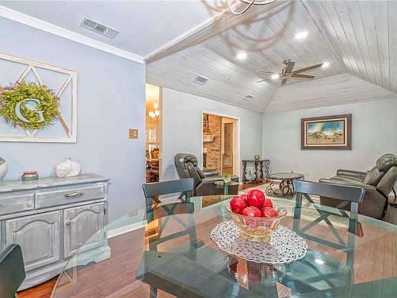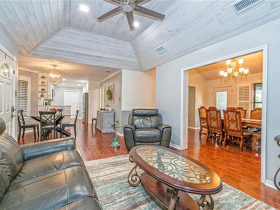 Enjoy sitting outside on .628 acres relaxing under the large trees. Open the front door and see how open the living/dining/breakfast/kitchen area is. Living area has whitewashed shiplap ceiling. Beautiful laminate floors throughout. Plantation shutters in living, breakfast, kitchen & formal dining area. Formal dining area has a fireplace and can also be used as a second living room. Enjoy cooking in this kitchen with recent updates, recess lighting, pull out shelves & easy close drawers. Split bedrooms. Large primary suite that has two closets. Primary bath has a tub & separate tile shower with glass door. Enjoy doing your laundry in this large laundry room with lots of cabinets & utility sink. Two bedrooms are large. The garage has three garage doors which makes it easy access to the back yard. Two sheds, generator, gutters with screens, playhouse, cameras. Dog run on side of house approx. 34' x 43'. Call your favorite realtor to view.