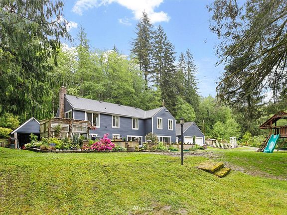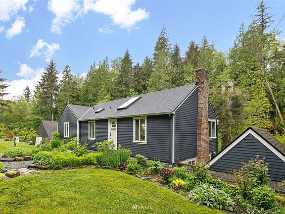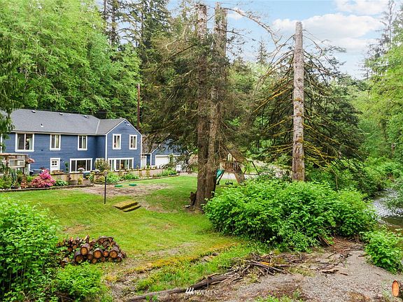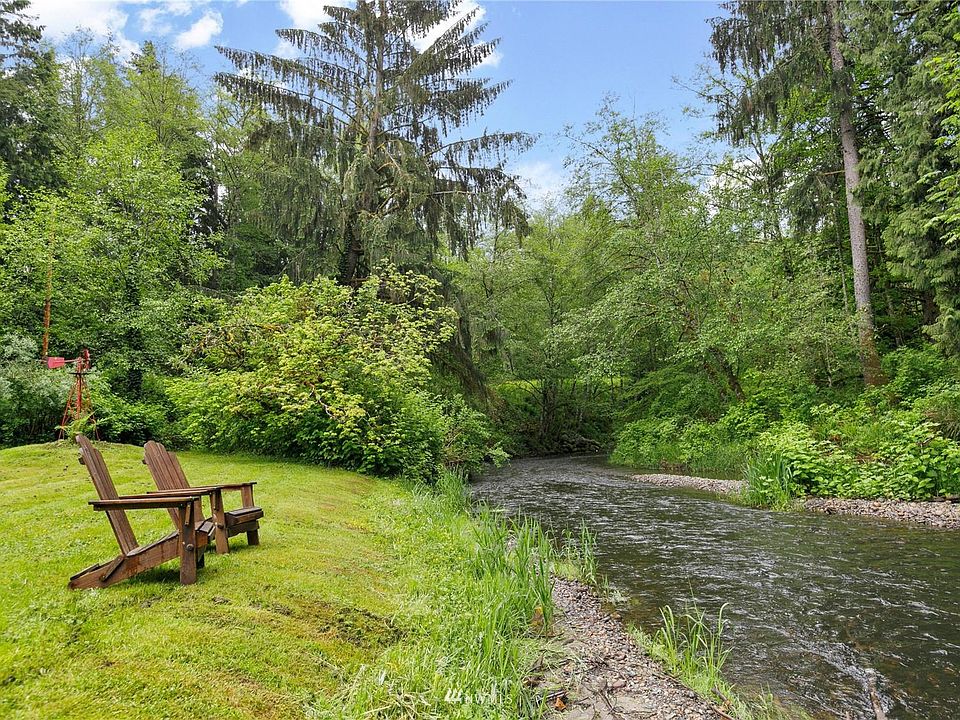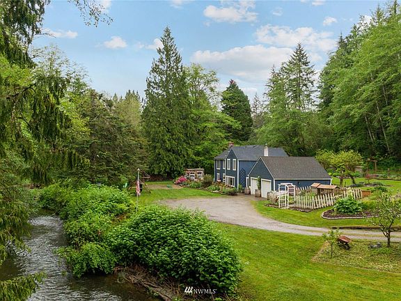 Gorgeous storybook setting w/over 175' of Friday Creek waterfront. This beautifully updated home sits on just under 1 acre lot and features gorgeous gardens, large detached garage, storage shed, greenhouse, brand new septic system, playset, private beach on the creek and so much more. Main level has great vaulted ceilings with fantastic natural light and features 3BR, Den that functions as a 4th BR w/attached bath plus HGTV style remodeled full bath and attic access for additional storage. So many updates throughout including NEW Hardiplank siding, exterior doors and Milgard windows throughout done in 2021 plus new roof in 2017. Enjoy all the unique spaces created throughout this one of a kind property and live a country fairytale life.