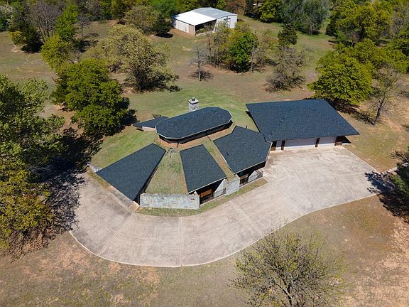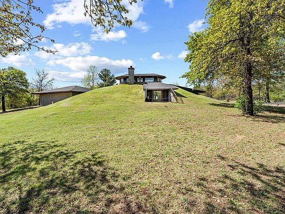 Welcome to a truly unique and eco-conscious home that offers energy efficiency, storm safety, and architectural flair—all nestled on 6 beautiful, fully fenced acres that includes a private gated entrance. You'll have the best of both worlds- peaceful country living with all the benefits of city life! This earth-sheltered gem features 3 spacious bedrooms -each with their own private bath and atrium. From the moment you step inside, you'll be captivated by the sloped walls, expansive windows, and hand-laid stone accents that flow throughout the home—including stone pavers and a stunning, oversized stone fireplace. Take the winding staircase up to a cozy loft with panoramic views of your wooded acreage—perfect for a quiet reading nook, office, or creative space. And thanks to the earth-sheltered design, you’ll enjoy superior insulation, low utility costs, and natural protection from Oklahoma’s storms. Recent upgrades include a brand-new roof (2025), new geothermal system, and water heater. Outside, there’s a 30x50 workshop with an attached 30x50 lean-to, ideal for hobbies, storage, or a small business setup. Located just minutes from Tinker Air Force Base, major highways, and downtown OKC, this home offers the rare blend of seclusion and convenience, character and comfort. If you’re craving something beyond cookie-cutter living, come experience the peace, privacy, and personality this unique home has to offer. Selling "as is."