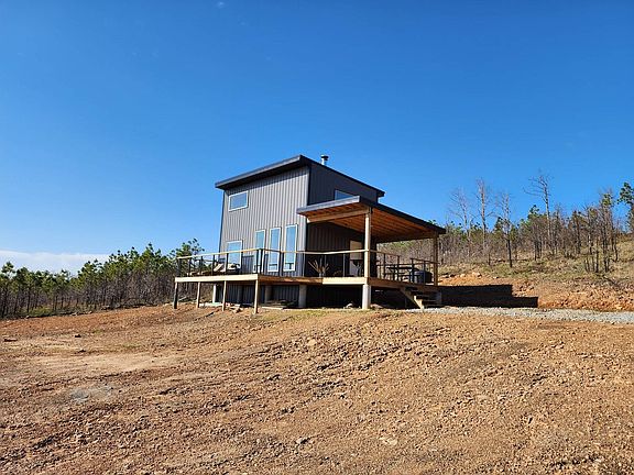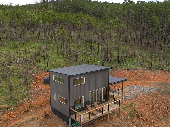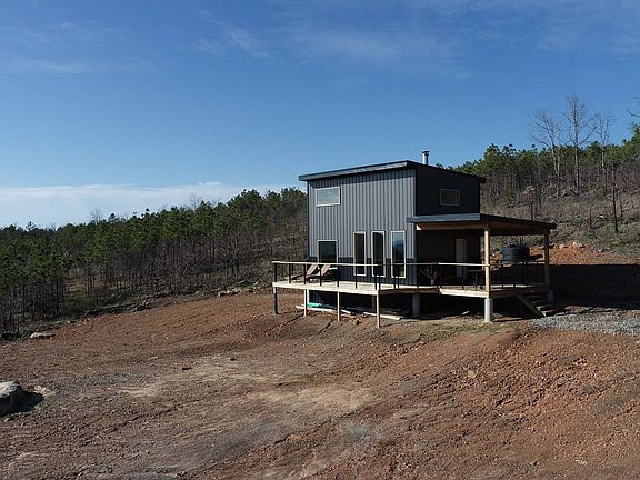 This property is located on the West side of the Poteau Mountain Range in Southeast Oklahoma in a very remote and secluded wilderness-type setting surrounded by miles of privately-owned timberland. The property is about 3.5 miles Northeast of the city of Heavener, OK, and 20 miles southwest of the city of Fort Smith, Arkansas. Oklahoma City is about a 4 hr drive and Dallas; Texas is about a 4-hour drive. GPS Coordinates: 34.933650; -94.567230 Physical Address: A physical address can be assigned by the LeFlore County EMS Office. Services to Property: This is off-grid property: Water: There is a 1000-gallon poly water storage tank. Roof guttering is being installed on the cabin to collect rainwater. The annual rainfall for this area of Southeastern Oklahoma is roughly 50 inches per year so a rainwater collection system is very practical. There is a multi-stage filtration system and water pump installed inside the cabin. Also, it is worth noting that there is a natural spring above the cabin that could potentially be utilized as a water source. Septic: The cabin has a conventional septic system. Propane Gas: There is a propane storage tank for the cabin that is used for the hot water heater and kitchen stove. Propane gas can be delivered from the nearby towns. Electricity: The cabin is currently wired so that a generator can be plugged in to power the cabin. Note: This property has a great south-facing exposure for solar efficiency and a solar system could be easily installed in the cleared area beside the cabin. Rural Mail Delivery: Rural mail service is available at the county road roughly 1 mile West of the property. Alternatively, a PO box can be assigned at the Heavener Post Office. Access to Property: This property has surveyed legal access by means of a dirt road. The access road is county-maintained up to roughly 1/2 mile from the property. The last 1/2 mile is a public road but not county maintained. Cabin: There is a newly constructed cabin on the property that has roughly 545 Ft2 of heated and cooled living space with 2 Bedrooms/1 Bathroom. The cabin was designed to be virtually maintenance free with the exterior covered with 26-gauge sheet metal and treated wood decking. The cabin has a pier and beam foundation with 12" diameter concrete piers with 24" diameter footings that are 5 feet deep. The cabin has 2" x 6" stud walls with extra insulation. The floor joists are on 16" centers. This cabin is well constructed with quality trim work throughout. The walls and ceiling of the cabin are finished out with rustic tongue and groove pine and the flooring is wood-colored laminate throughout. Energy-efficient vinyl double pane windows throughout. All furniture and decorations shown in the pictures will convey to the new owners. The cabin features a wood-burning stove, functional kitchen with appliances, downstairs bedroom and bathroom, upstairs sleeping loft, utility closet, covered porches, deck, a pond, and 20 acres. This property is unrestricted. Agents Comments: Beautiful wooded and wilderness-type property in a private and secluded location surrounded by miles of privately owned timberlands. Excellent recreational property with a diverse variety of terrain and some unique features including rock outcroppings and panoramic mountain and valley views. Excellent hunting for deer, squirrel, turkey, wild hogs, rabbit, quail, and other game. A surveyed legal easement for access is rare for South-eastern Oklahoma mountain land. There are several miles of logging roads surrounding the property which are great for ATV riding.