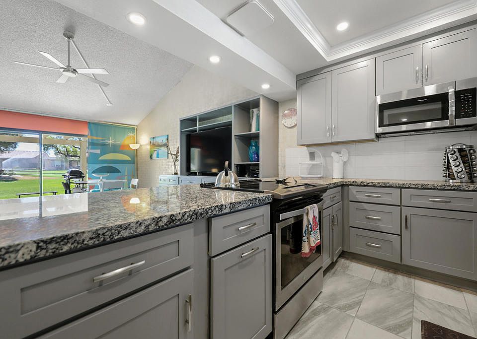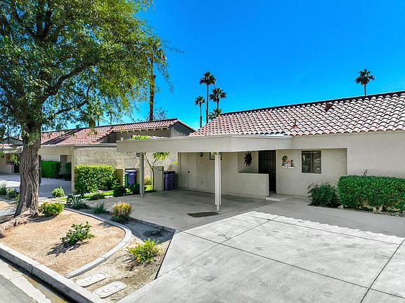 This desirable 2 bedroom/2 bathroom condo, located in the popular Palm Desert Resort Country Club, is nicely remodeled and offered turnkey furnished. The kitchen boasts stylish stone counters and stainless steel appliances, as well as newer cabinets painted cool gray with upgraded hardware. The guest bedroom, currently used as an office, has an en suite bathroom. The south-facing covered patio offers views of a greenbelt, pool and mountains. Relax on your patio while enjoying a beverage and have a BBQ. A stacked washer and dryer is located next to the water heater in a separate closet behind a locked door in the carport. The private carport offers shade for one car and an open space next to it for another. Quiet interior location! Conveniently located not far from the clubhouse, which offers many social activities, 20 pools and spas, bocce ball & more included in HOA dues which covers roof and exterior walls. Golf, tennis & pickleball are also available here but not included in HOA dues. This is a great home for vacation getaways, a second home, or for year-round living. Investors take note: Short Term Rentals are allowed. Located mid-valley, with easy access to I-10, world class dining, shopping, the Indian Wells Tennis Gardens, entertainment, and more, you will love the lifestyle in the Palm Desert Resort Country Club. You own the land, and like a duplex, you share only one wall. Call today to schedule a private tour of this desert paradise!