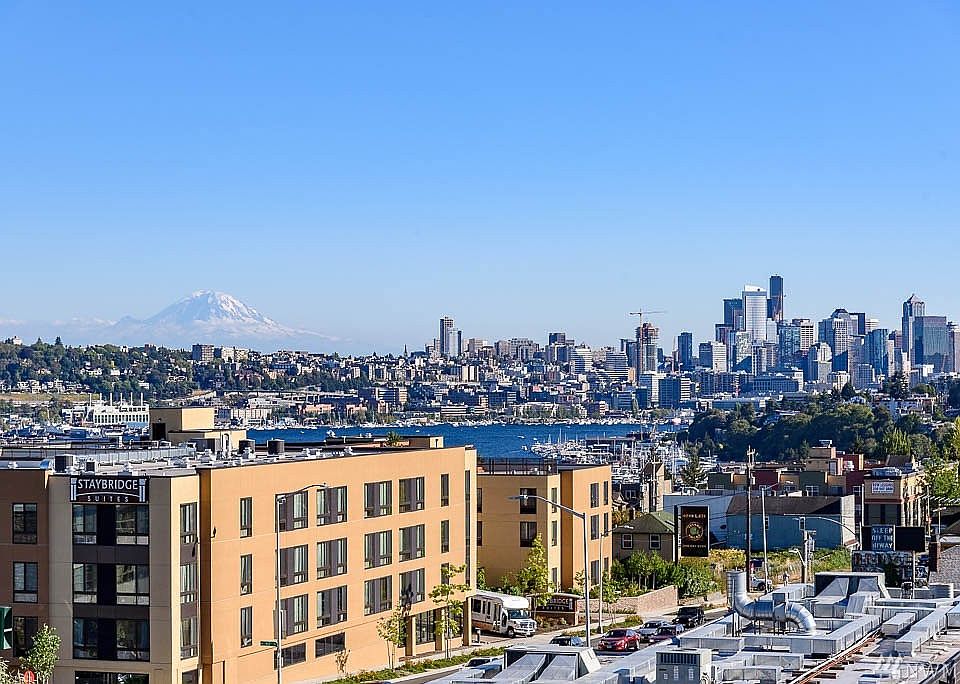 This rear penthouse unit is a complete package!Sweeping views of Lake Union,Mount Rainier & Seattle Skyline,sound & energy efficient building,high ceiling rooms w/full size windows,new driftwood flooring,kitchen equipped with SS appliances and tall cabinetry,in-unit laundry,sunny deck & community rooftop P-Patch w/gas BBQ,secure building w/elevator & garage w/assigned space.On top of all that amenities a short commute to Downtown makes it ideal for urban living.No rental cap,strong & low HOA's.