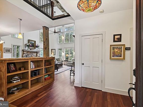 Come see this idyllic retreat situated in a park-like setting surrounded by nature with only two houses at the end of a private driveway. The 1st floor features a 22’ great room with an 18’ ceiling with wood beams, 18 windows, a stone wood burning fireplace and beautiful Brazilian cherry wood floors. An open eat-in kitchen boasts a large butcher block table, generous maple cabinets, concrete countertops with brick tile backsplash and more - A SS farm sink, a Wolf SS gas range with a SS exhaust fan, a Bosch refrigerator, 2 Kalamera refrigerated wine cabinets and an adjacent bar area/mud room round out this space. The primary bedroom suite is also on the 1st level with cherry wood flooring, two walk-in closets and access to a private, covered side porch - A primary sitting/dressing room is attached. The primary bath has a large steam shower and double vanities with concrete countertops and polished stone flooring. A laundry room and powder room are situated off the front foyer. The 2nd floor consists of two spacious bedrooms with walk-in closets + a full bath with a tub/shower combo. Enjoy the 18’ open loft/family room with a beamed ceiling and a dramatic view of the great room below. The lower level has a 28’ x 28’ unfinished space with a rough-in bath, 8’ ceiling, and 2 daylight windows that could easily be converted into one or two rooms - A utility room provides access to the 2-car attached garage. The property consists of a 2 acre lot backing to woods with a large, fenced yard with play equipment, a 19’ Timber Tech deck and a small patio - Additionally, there is a 21’ covered side porch and a 2-car attached garage with a driveway for multiple cars.