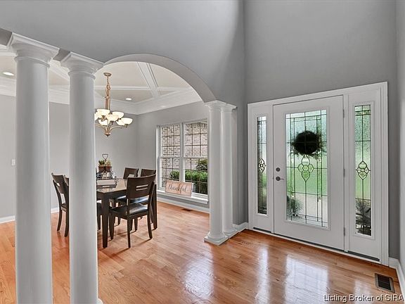 Welcome to 4031 Viewcrest Loop, a truly remarkable residence nestled in the picturesque town of Floyds Knobs, Indiana. This luxurious 5-bedroom, 4-bathroom home offers a harmonious blend of modern elegance and natural beauty, providing the perfect retreat for you and your family. With its stunning views and exceptional features, this property is sure to captivate your heart. Formal dining room with columns and great detail in the tray ceilings. This living room brings in an ample amount of natural light with 17ft ceilings including a unique staircase in the living room. New flooring, wood floors just refinished, new carpet, and Luxury Vinyl Plank flooring in the basement. The interior walls are freshly painted. The character and details flow throughout the architecture of this home. Master bedroom/bath with tray ceiling, double sinks, jetted tub with a stand up shower, and closet. The upstairs has three bedrooms with all new flooring and a full bath. One of the bedrooms has a balcony overlooking the living room providing a unique viewpoint of the living room. The basement has a great space for a family room with 9 ft ceilings and or game room with a full bath. The basement also has the 5th bedroom for an option of a 6th bedroom with office space or even a work out room. This home won't last long! Schedule an appointment with us today!