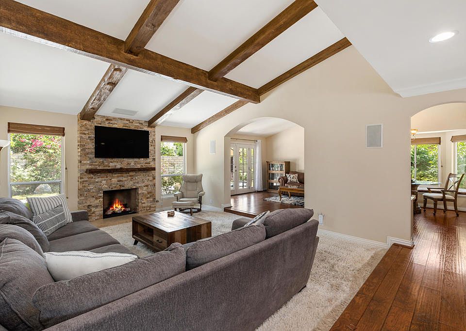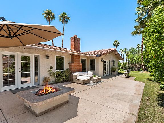 This Stunning three-bedroom, two-bath, Single-family home is in the Sagewood community of Palm Desert. The previous seller says home is approximately 1900 sq ft. Seller owned SOLAR. The home has a newly installed Solar Energy System-fully paid for. Seller says with 23 panels, 1.45 times the current usage. Buyer to verify. The living room features a high ceiling with natural wood beams, a stacked stone fireplace, and crown molding. The home is equipped with 5 five wall-mounted televisions. The kitchen has stainless steel GE Monogram appliances, modern white cabinets, light countertops, and a redbrick-style backsplash--a cozy breakfast nook with bay window, bench seating and storage underneath. The Primary bedroom suite includes a built-out extension with French Doors, a desk area, a bathroom with dual sinks, an oval free-standing tub, a glassed tiled shower, and walk-in closet. Primary bedroom, family room with French doors open to a large patio with a fire pit, barbeque, and an extra-large leisure area, and room for pool/spa. Additionally, there is a 12 x 15 ft. zero maintenance synthetic turf putting green with four holes and an extra-large synthetic turf area in the rear side yard. Several varieties of citrus trees. The Sagewood community has plenty to offer -- including a basketball court, community pool/spa, and two tennis courts.