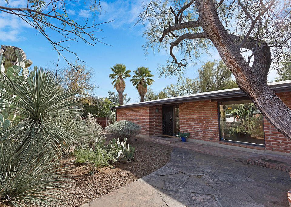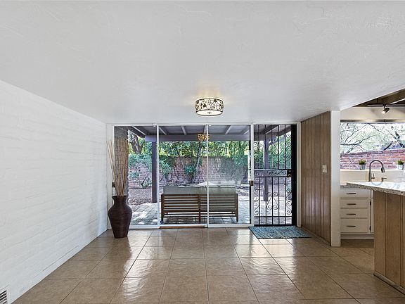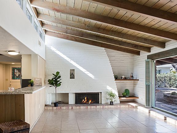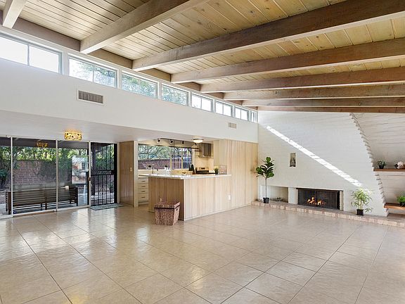 Mid-Century Architecture in Poet's Corner. Great room concept with 17 in. ceramic tile through-out. Wood beamed vaulted ceilings, wood burning fireplace with built-ins, large glass panel windows with views to the lush outdoors. Retro 1950's full bathroom in Jadeite green ceramic tile. A cook's dream kitchen with gas stove, overhead glass hood which vents to outside, white cabinets, granite counters, stainless appliances and windows to the outdoors. Brand new plumbing from the faucets to the meter. 2 car carport on .23 acre lot.