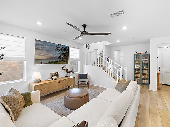This stunning 3 bedroom plus loft detached home with solar panels is located in the gated Ellis at Bedford community in South Corona. The open-concept boasts luxury vinyl plank flooring, modern white cabinetry, and quartz countertops throughout. Spacious living room surrounded by windows and kitchen with ample storage, stainless steel appliances, an island with sink and seating that opens to the dining area and views of the backyard. Upstairs boasts a loft situated between two secondary bedrooms perfect for secondary family room, game room, or study. Huge primary bedroom with seating area and walk in closet opens to the primary bathroom with tiled flooring, expansive dual vanity and shower with glass enclosure. Convenient upstairs laundry room completes the second level. The backyard is thoughtfully designed with balance between hardscape and green space, creating a harmonious outdoor environment that is both functional and inviting. This turn key home boasts Mediterranean design with modern features.