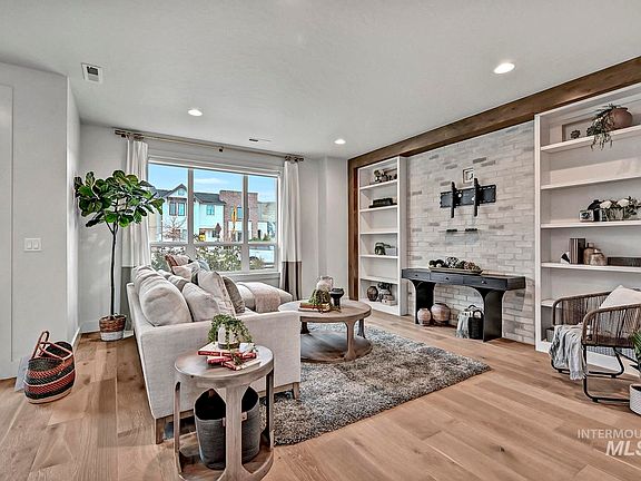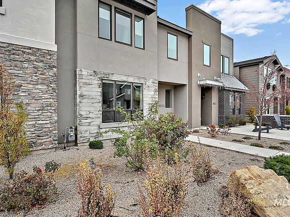 Welcome to this exceptional, light-filled townhome situated in the desirable Harris Ranch neighborhood. This home embodies modern living at its finest, offering a perfect blend of functionality, style, & location. Step into the spacious living room adorned w/ a striking brick wall featuring built-in shelves, complemented by a beautiful framed stained wood beam. The kitchen is a culinary haven w/ custom-painted cabinets, quartz countertops, & upgraded appliances. A tech center equipped w/ two workstations awaits, cleverly concealed by a chic barn door. Upstairs the primary bedroom is a peaceful sanctuary w/ a stunning en-suite bath highlighted by shiplap accents, dual sinks, fully tiled walk-in shower, & walk-in closet. Enjoy a private courtyard patio w/ raised garden beds & lots of entertaining space. Nestled between the base of the foothills & the Boise River + minutes from Downtown Boise. This home boasts an idyllic location, offering an unparalleled blend of natural splendor & cosmopolitan accessibility.