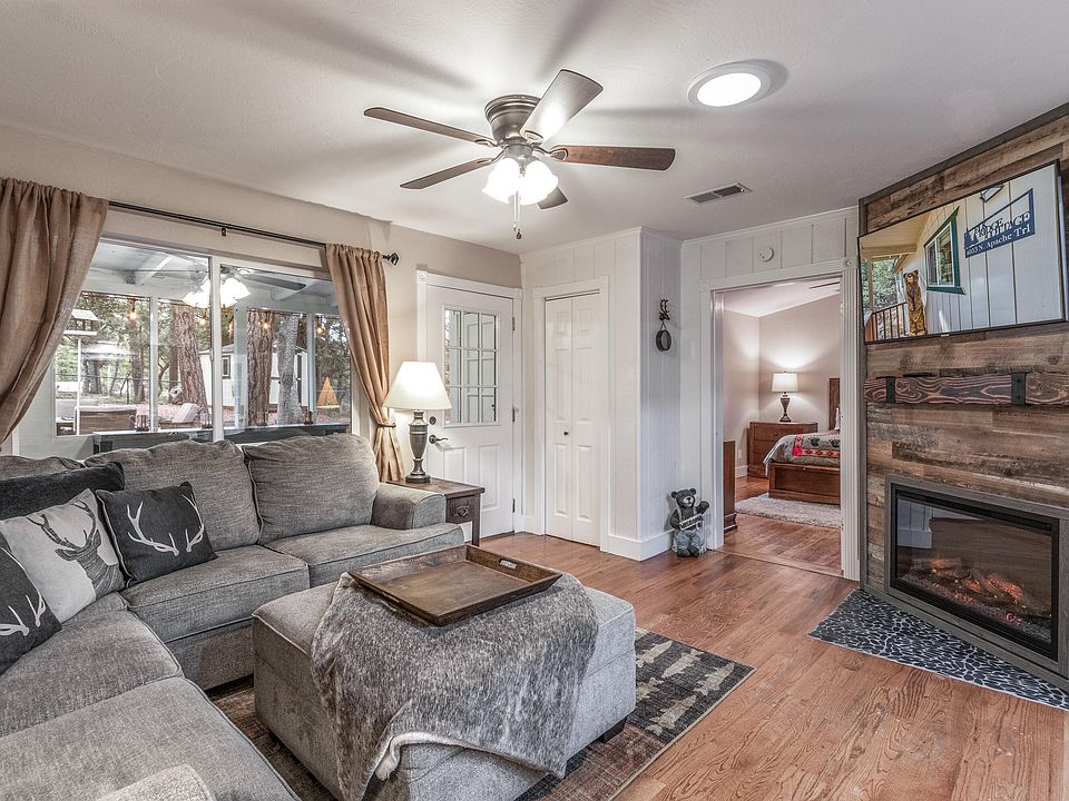 Rich with exterior features! This delightful 3-bedroom, 2-bathroom cottage style is perfectly situated in Pine. Exteriors include a deck, patio, a screened back porch, wood burning fire pit, propane table fire pit, patio furniture and BBQ. The back yard sits on a community game trail where you can see elk and deer just about every day. The back yard is fully fenced in with a shed, horseshoes, and gate opening to get to the community trail that leads to the National Forest. Within this beautiful home, you'll find the warmth of a fireplace, AC and Heater and plenty of natural lighting. With plenty of elbow-room, the kitchen brims with creative possibilities. The split floor plan allows for a peaceful master bedroom. The other two bedrooms are designed with plenty of wardrobe storage and very nice sized rooms with queen beds. This house comes fully furnished with all linens, kitchen items, towels, furniture and all the décor. This one is the right house at the right time for you. An owner of this home is a Real Estate Agent in the state of AZ