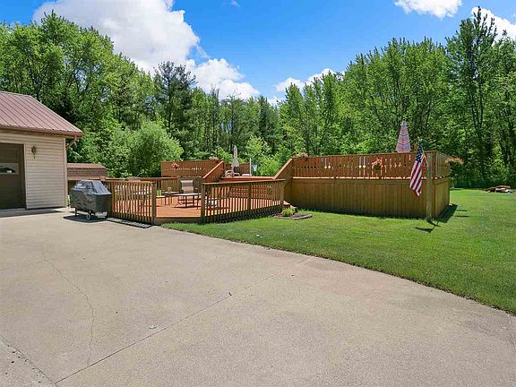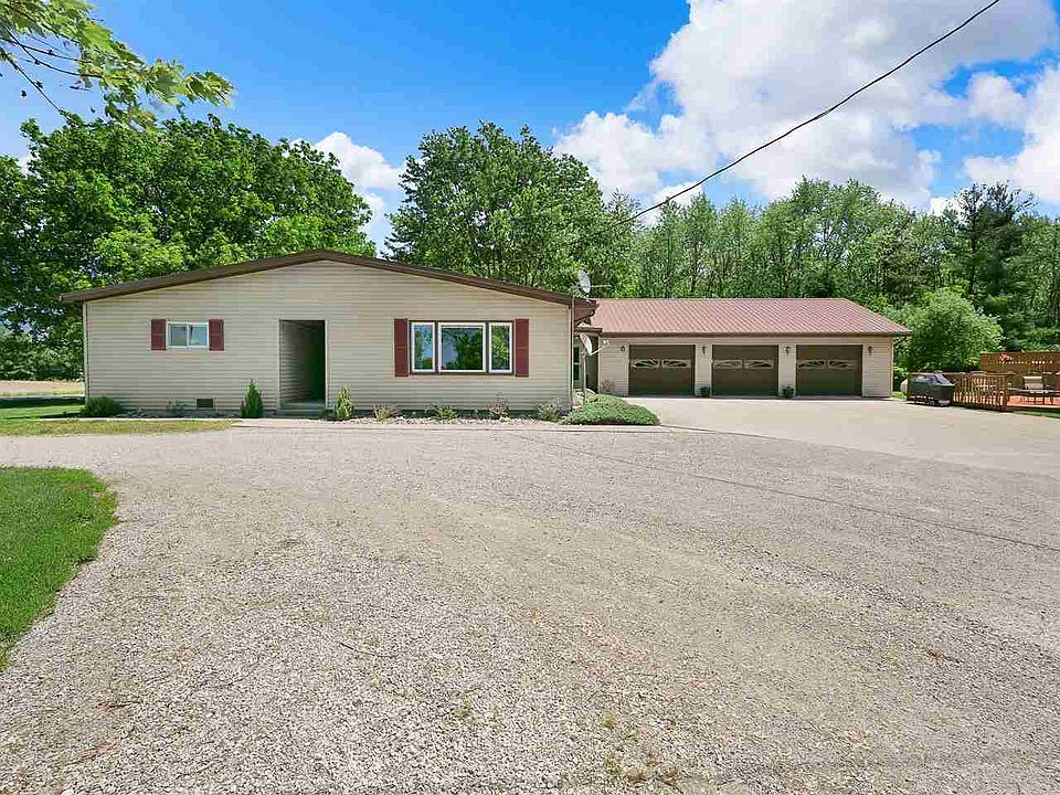 Wait! Have you always dreamed of living in the country? This country property offers a great location! Only about 1 mile from city limits but definitely country! Located on 25.5 acres with wooded acreage but also plenty of room not only for a 3 bedroom, 2 bath ranch home with attached 3 car heated garage, complete with kitchenette, TV hook-up, desk, epoxy coated floor, and plenty of cabinets to keep everything neat! The property also includes a large outbuilding big enough for 3 cars with extra storage room and carport to shelter boat, car, or trailer, large above ground 30 ft. round swimming pool with deck with several levels to provide lots of space for entertaining and just having fun! Additional shed (approx. 18 X 10) and even a chicken coop! Raised flower/vegetable gardens in an attractive setting! Great deer and turkey hunting. 2 hunting box blinds in the woods stay. Planted food plot. Amazing amount of storage! Two of the bedrooms even have built-in chests as well as double closets! Living room has lots of natural light and large windows to enjoy the beautiful views! Master bedroom with ensuite has whirlpool tub as well as walk-in shower, and double vanity.